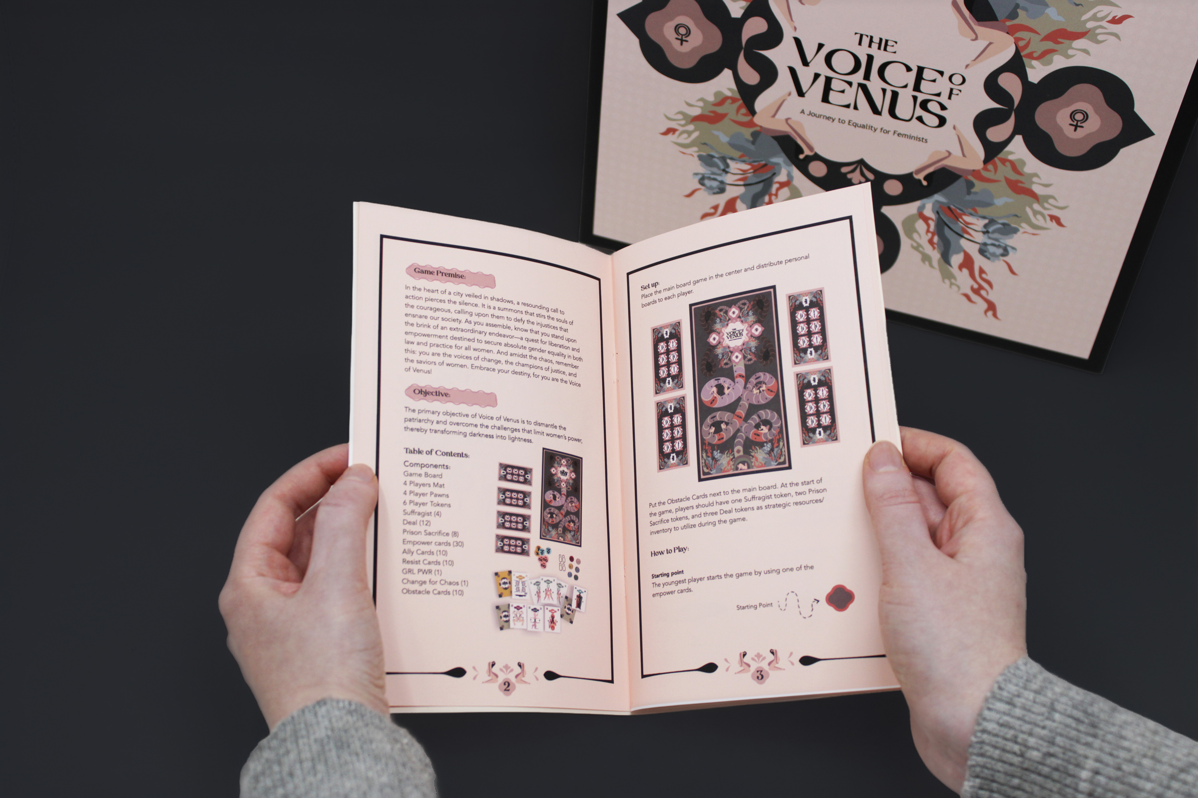The Voice of Venus is a board game designed to explore themes of gender equality and social justice through strategy and narrative. Players navigate challenges, form alliances, and make critical decisions that reflect real-world struggles for equity. The game integrates storytelling and interactive mechanics to engage players in a thought-provoking experience that highlights the fight for systemic change.