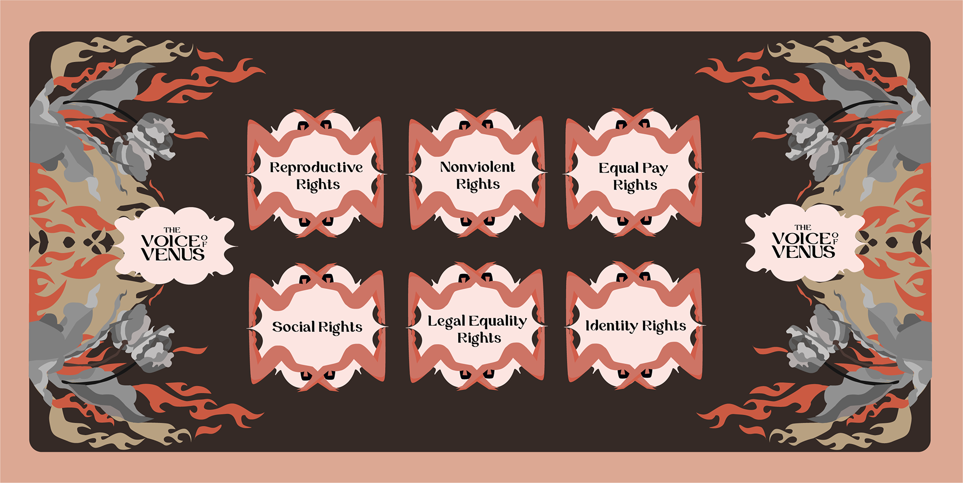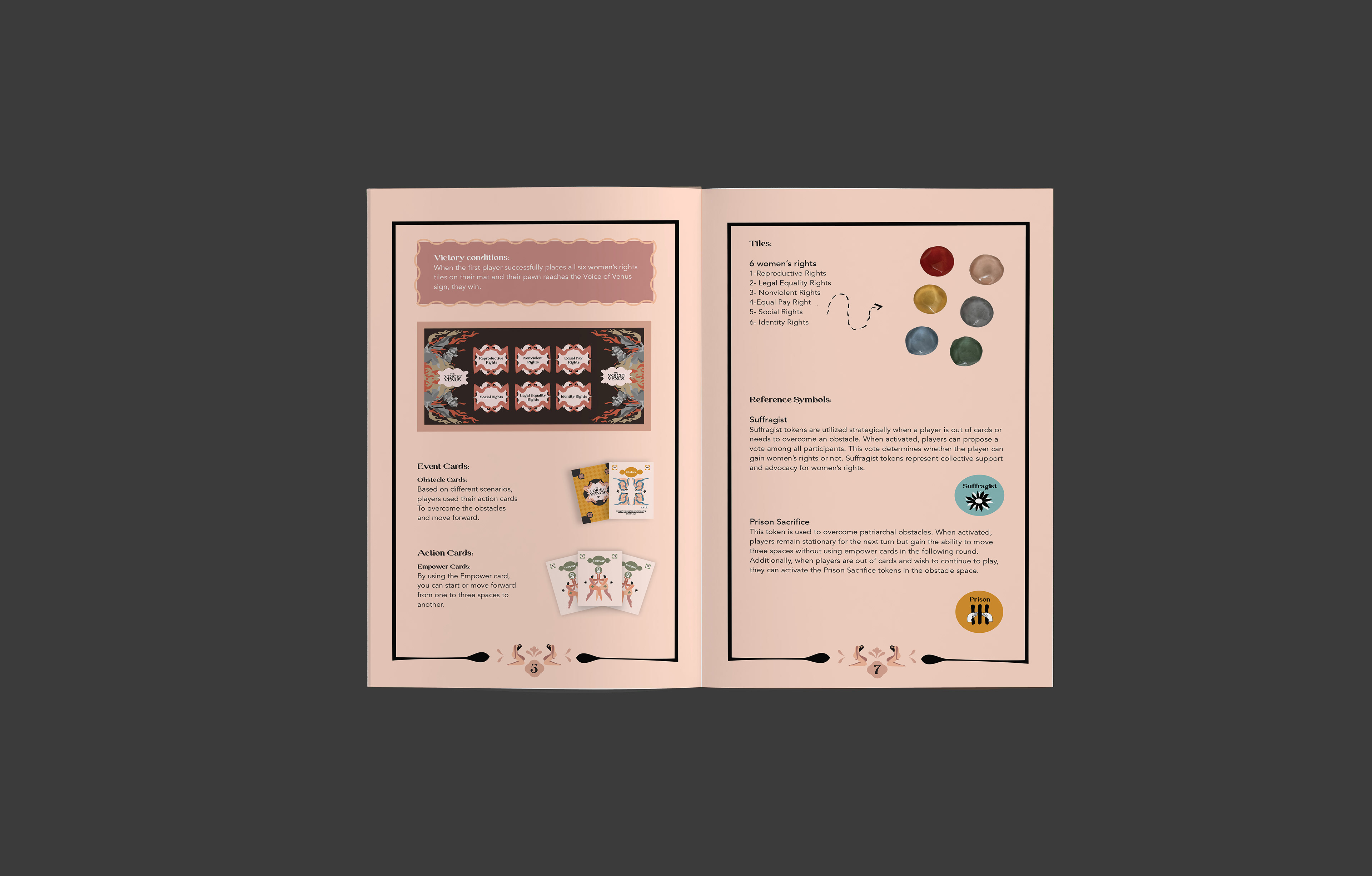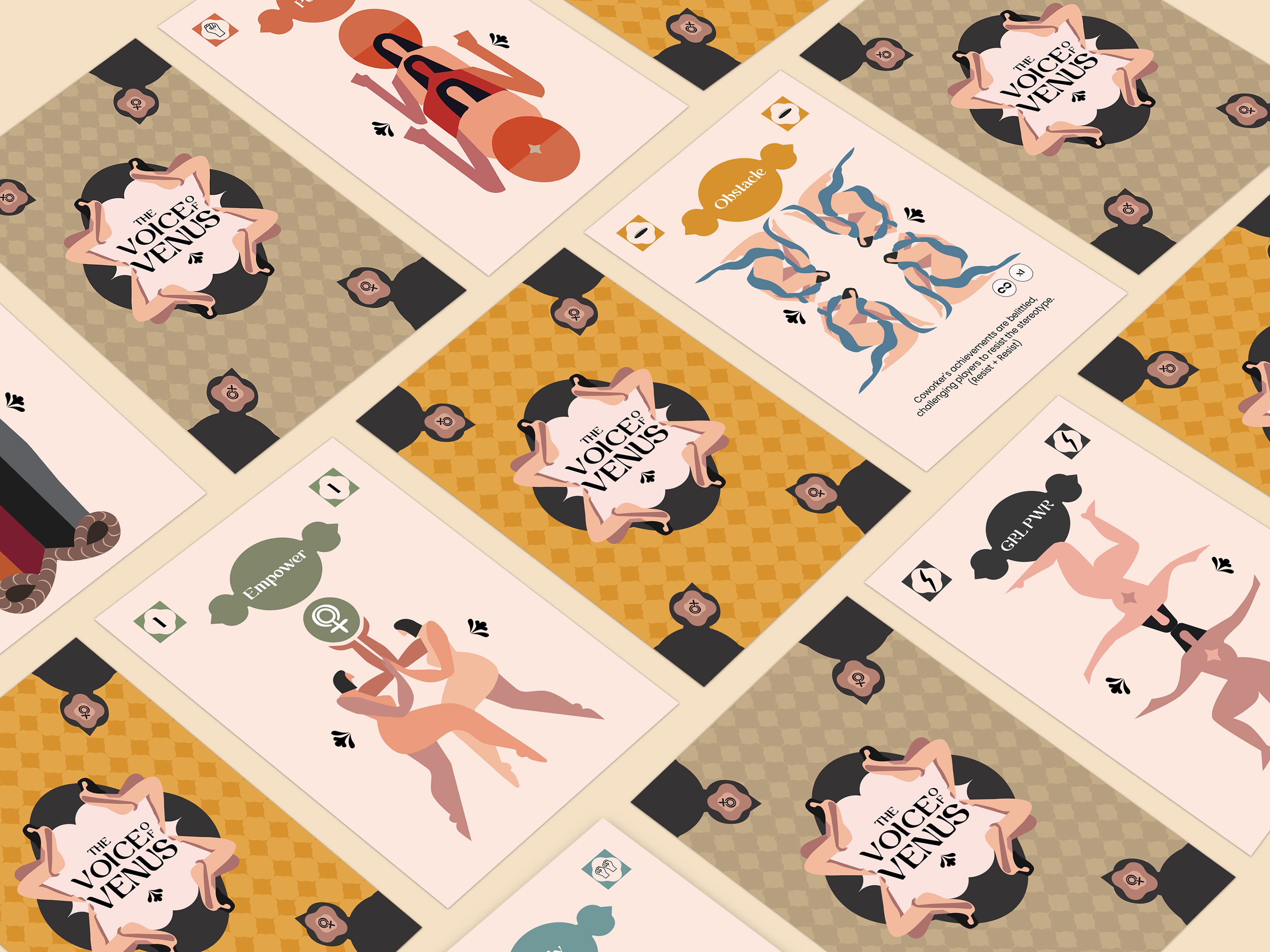 The design process for Voice of Venus involved extensive research on gender equality movements, historical struggles, and systemic challenges. The game mechanics were developed to balance strategy, collaboration, and narrative-driven decision-making, ensuring an engaging yet meaningful experience. Visual elements were carefully crafted to reflect the game’s themes, using symbolic iconography, bold typography, and a rich color palette to reinforce its message.