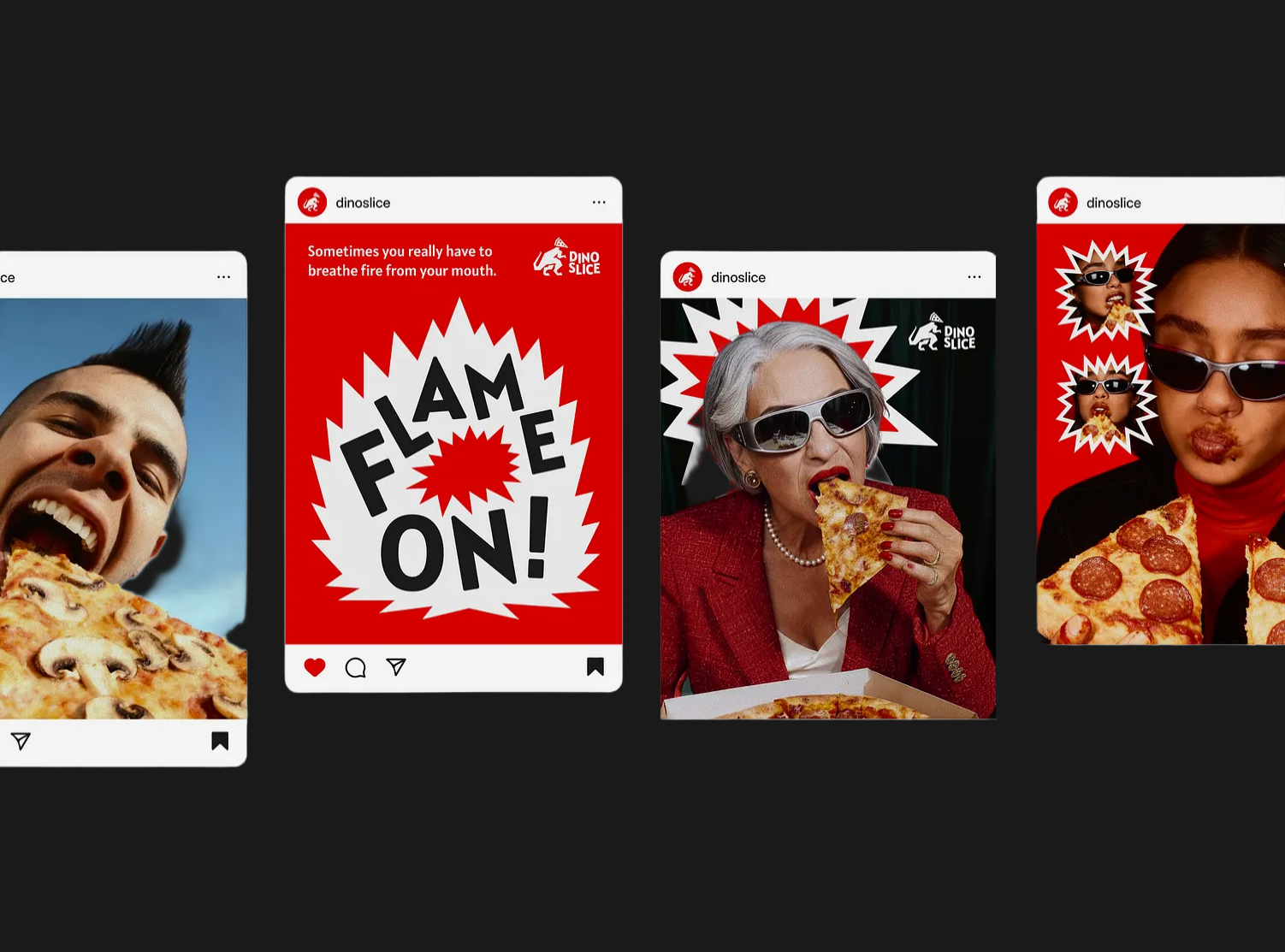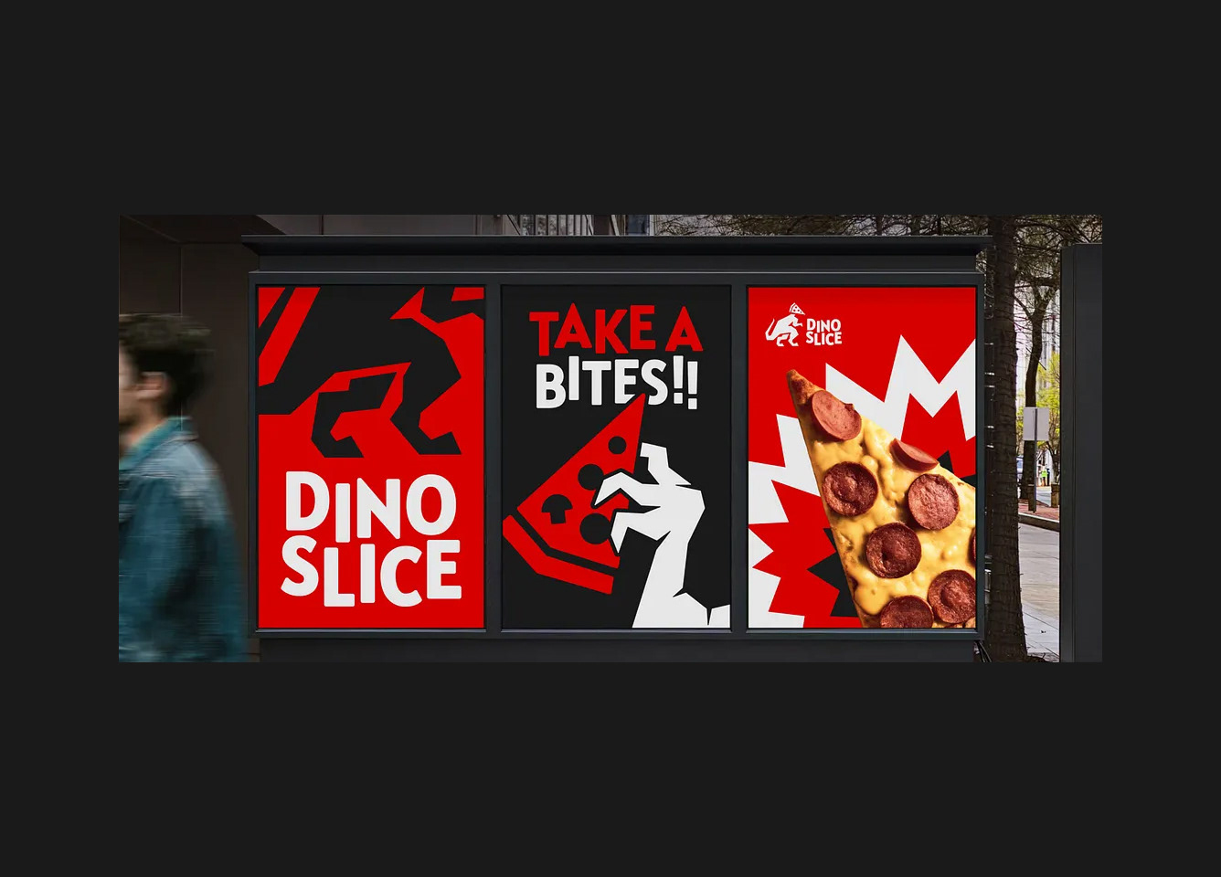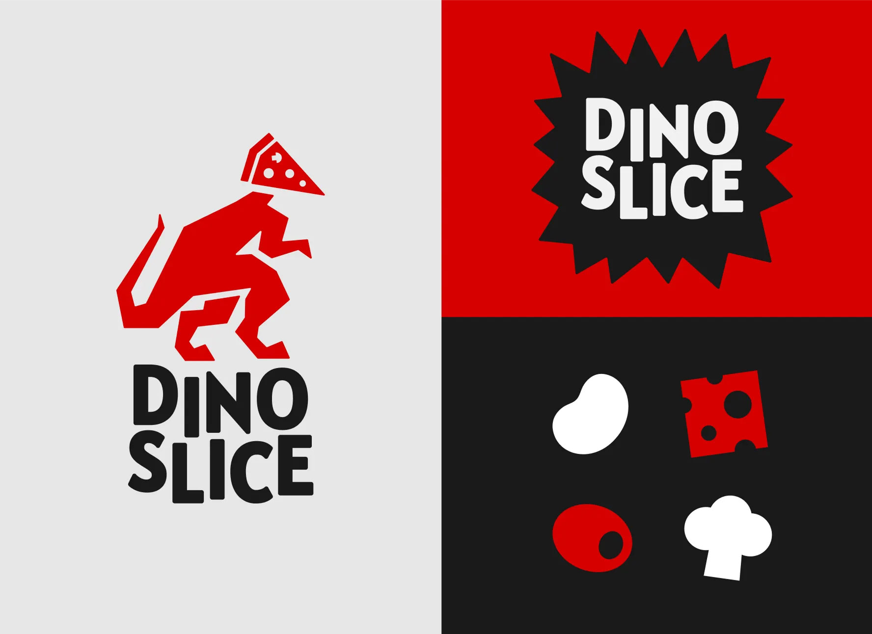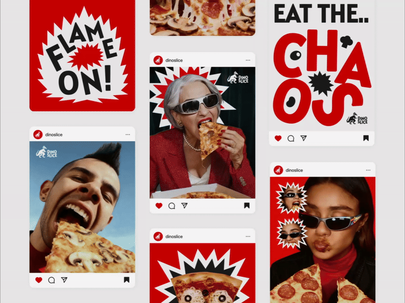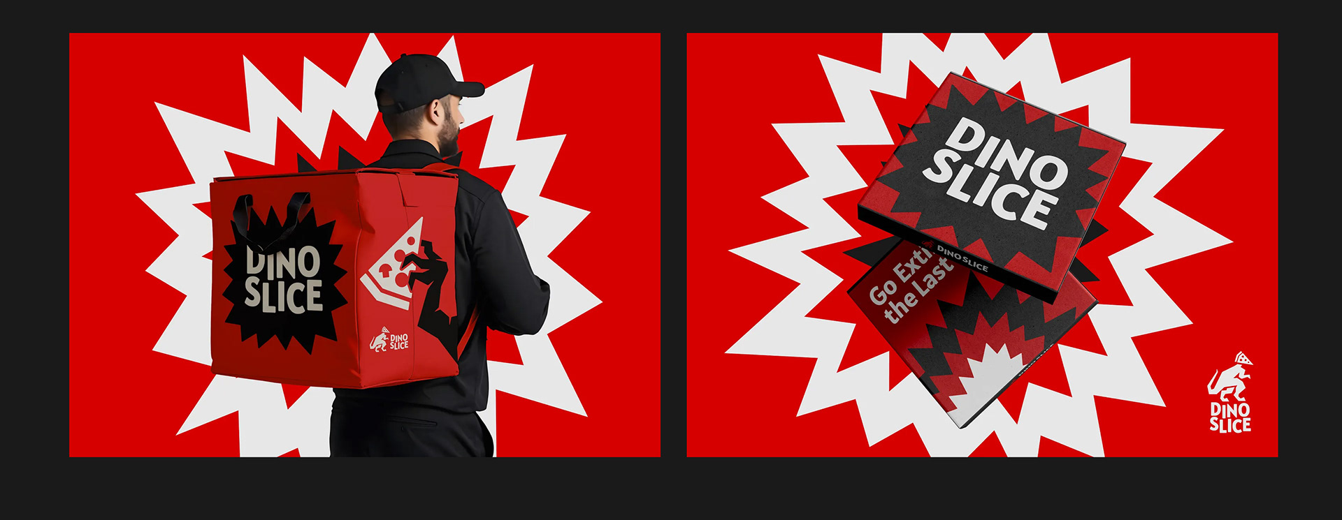 The visual identity of Dino Slice roars with confidence—featuring a striking color palette of fiery red, deep black, and crisp white that captures energy and appetite. Dynamic typography, sharp geometric bursts, and the fierce dinosaur mascot create a sense of movement and power, echoing the thrill of taking a huge, cheesy bite. The overall design language is expressive and fearless, combining humor, impact, and visual rhythm to make the brand instantly recognizable and irresistibly fun.